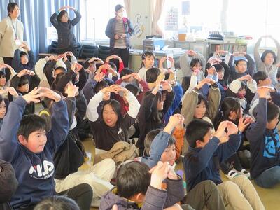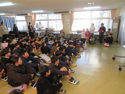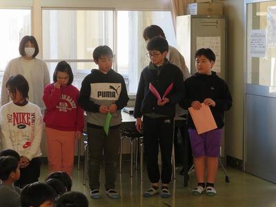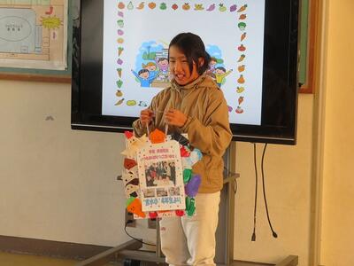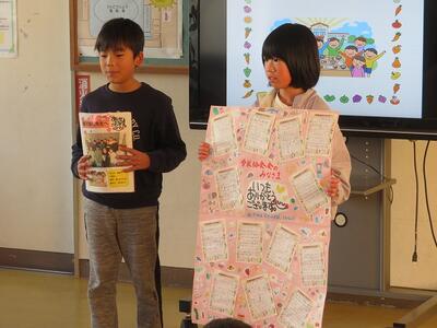 1月22日(木)に給食感謝集会を行いました。保健・給食委員会の子どもたちが進行しました。まずはじめに、給食の歴史が紹介されました。鯨肉の給食が紹介されると、子どもたちはとても驚いていました。その後、各学年から給食を支えてくださっている方々へのプレゼントの紹介がありました。後日、栄養教諭から手渡されることになっています。また、給食に関するクイズも出され、楽しそうに答えていました。クイズの解答に関する解説では、調理員さん方が映像で登場し、調理員さん方からのメッセージも伝えられました。今回の給食感謝集会をとおして、給食を口にすることができるまでには多くの方々が関わっており、それぞれの方々の思いが込められていることを子どもたちが感じることができたと思っております。感謝の気持ちをより強く持ちながら、これからもおいしく給食を味わってほしいと願っております。