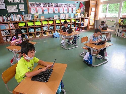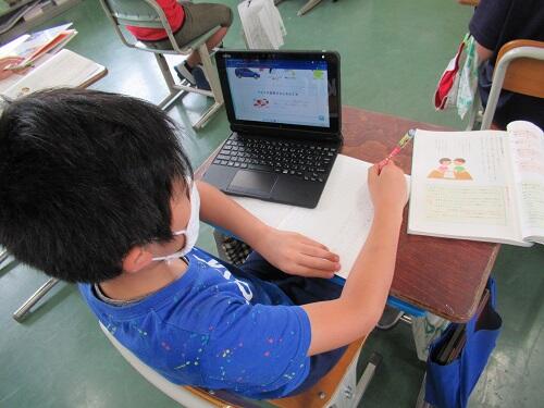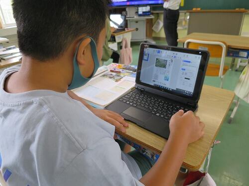 1校時、5年生は国語で「報告文」の組み立てメモを作成していました。報告する内容をインターネットで調べたり、本で調べたりしていました。