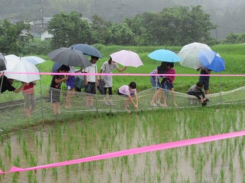 5年生は登校すると田んぼでアイガモのお世話をします。
