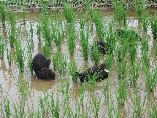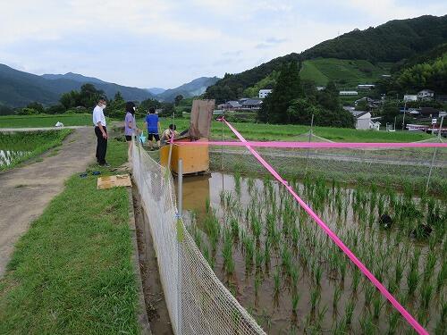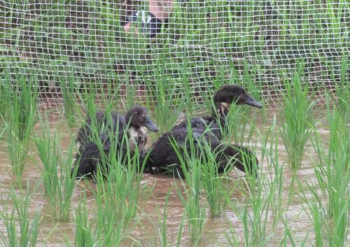 巣箱からアイガモを田んぼに放ち、巣箱のそうじをします。アイガモは、とても元気にえさをとっています。
