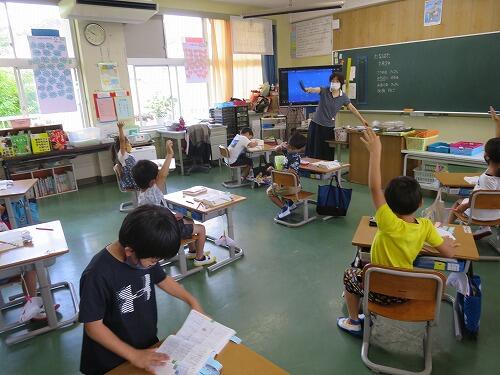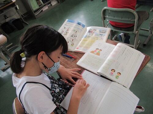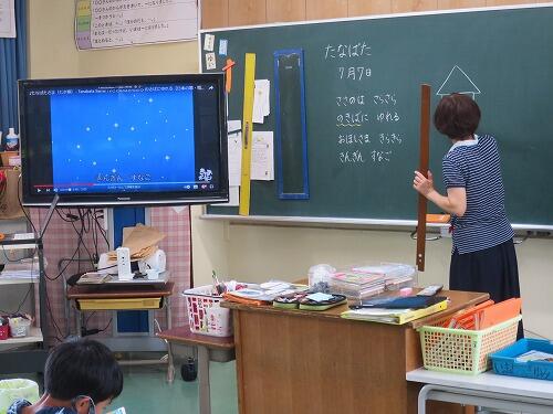 1年生の教室では、先生が七夕の話をしていました。七夕の歌を歌い、歌詞にでてくる「のきば」の意味が分からないと、辞書を使って調べていました。ふだんの生活の中でも分からない言葉の意味を調べることは大切ですね。