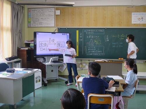 6年生は、分数の文章問題に取り組んでいました。部分を分数で割って全体を求める問題です。考え方がとても難しい問題ですが、図、関係図、線分図などを用いて、友達にもしっかり説明できていました。