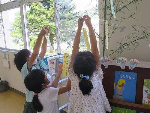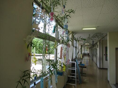 1、2年生が願い事を書いた短冊を結び付けた笹を廊下に飾っています。やはり、「コロナがなくなりますように」など、コロナ関連が多いようですが、中には「家でいっぱい犬がかえますように!」や「アイドルになれますように!」など、かわいらしいものもありました。