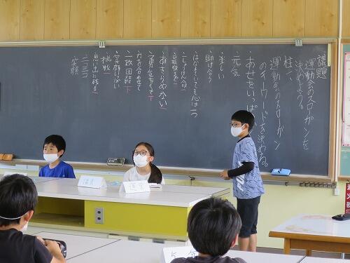 代表委員会では、9月に予定されている運動会のスローガンについて話し合っていました。スローガンに入れたい言葉を出し合い、意見をまとめました。