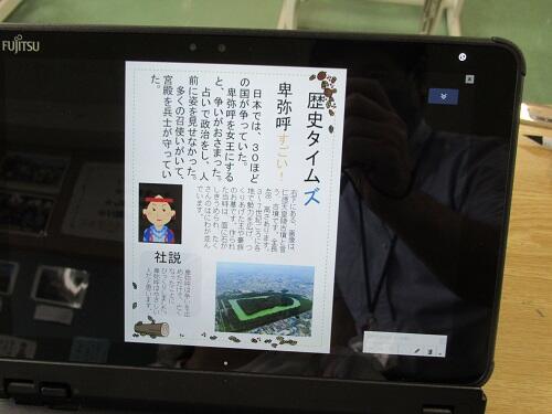 1校時、6年生は、社会科で「歴史新聞作り」をしていました。パソコンで作成するので、訂正も楽にできるし、写真もコピーして楽に貼り付けられます。パソコンならではのよさです。