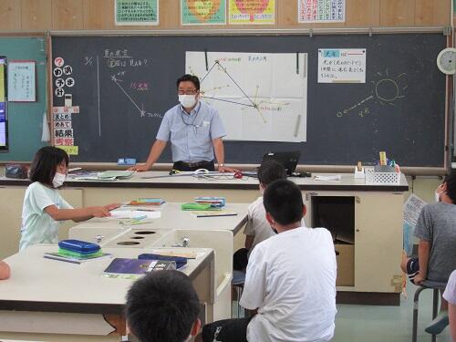 5校時、4年生は理科で「夏の大三角」について学習しました。今日は七夕ということもあって、おり姫星(ベガ)とひこ星(アルタイル)の距離について考えました。「その距離は何と15光年です。」と言ってもどれくらい離れているのかさっぱり分かりません。そこで、「1光年は、光が1年間に進む距離です。」「光は1秒間に地球を7周半します。」と言ってビニルテープで矢野先生が説明したら、さすがに「えっ~」と子どもたちから驚きの声が。