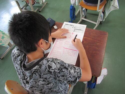 朝の時間を利用して、5年生はスポーツテストの記録を正式な用紙に書き写していました。今後は、この結果を分析して、子どもの体力向上に生かしていくことになります。