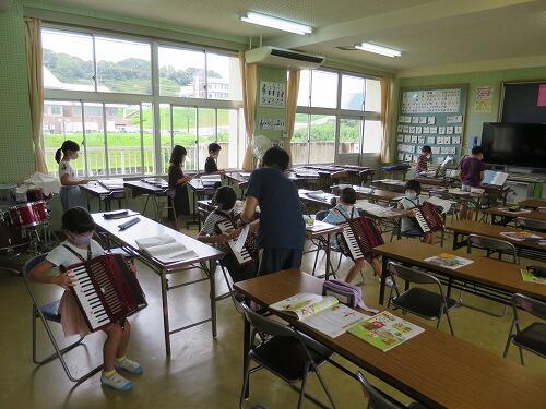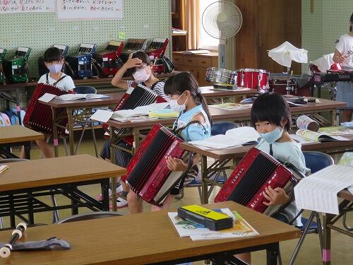 木琴や鉄琴、アコーディオンなど、様々な楽器で演奏しています。自分のパートの楽譜をよく見て、練習を頑張っていました。