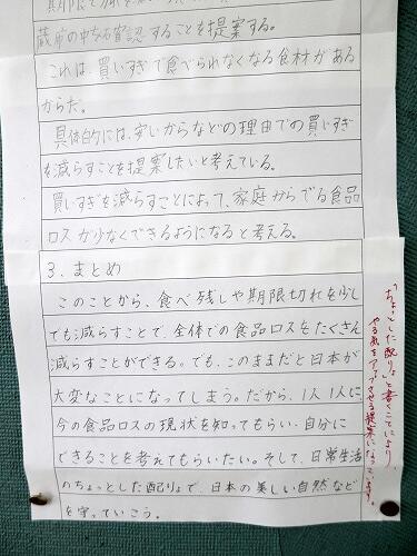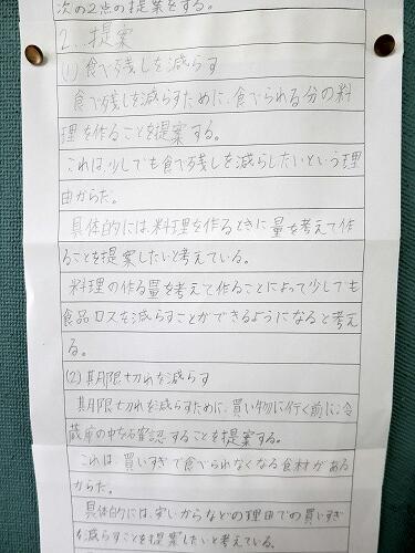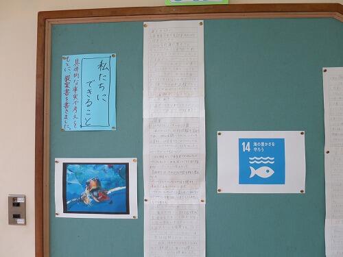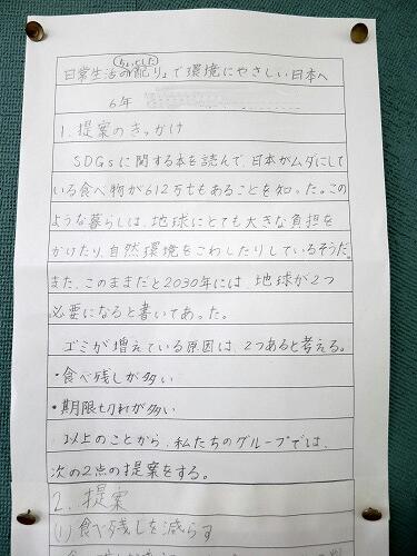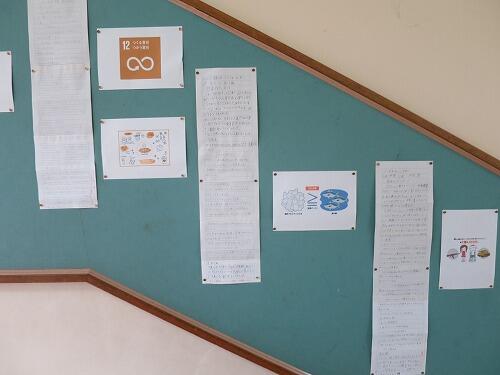 6年生が国語の学習で、具体的な事実や考えをもとに提案書を書くねらいで、SDGsに関する提案書を作成しました。階段に掲示しています。