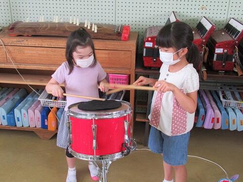 2校時、2年生は音楽でした。まず、CDで音を聞いて、どの打楽器の音かテストをしました。次に、どんな音がするのか、実際にいろいろな打楽器を叩いてみました。