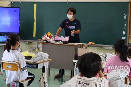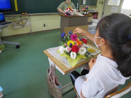 「みやざき花で彩る未来」推進協議会の皆さんの御協力で、6年生とたんぽぽ学級の子どもたちが、フラワーアレンジメントに挑戦しました。これは、「花育」といって、花や緑に親しみ、育てる機会を通して、やさしさや美しさ、作る楽しみ飾る喜びを感じる気持ちを育むことを目的としています。