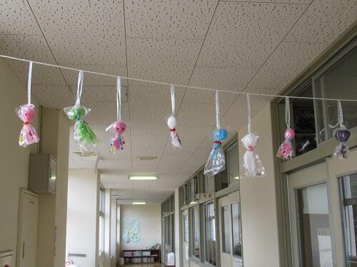 1年生の廊下には、1年生がつくったてるてる坊主が飾ってあります。1年生がそれぞれつくったてるてる坊主は、どれも個性的です。効果が出たのでしょうか、見事に梅雨明けとなりました。