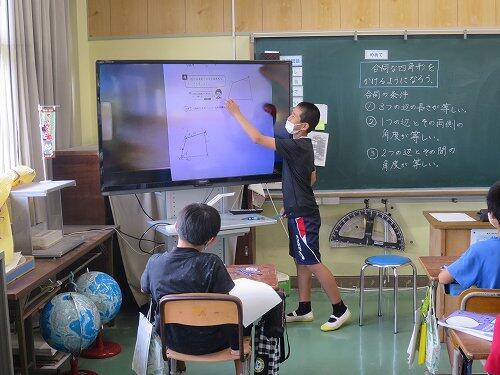 5年生は合同な四角形の作図の仕方について学習していました。合同な三角形の書き方を使って書いていることをみんなで話し合っていました。