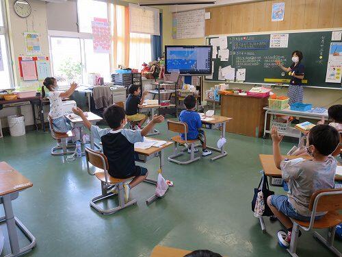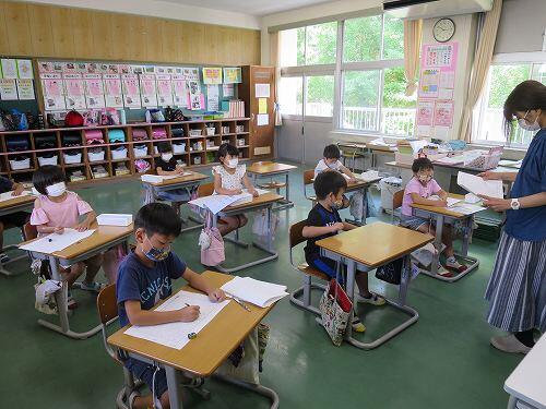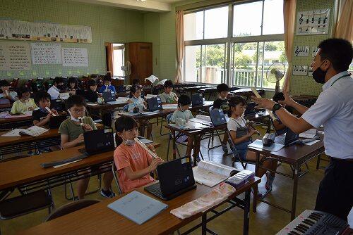 2校時、1年生は音楽でした。海「海は広いな 大きいな」の学習をしていました。その後、ドレミの学習をしました。阿野先生から音楽ノートをもらった児童は、みんな「ありがとうございます」とお礼を言っていました。礼儀正しい子どもたちです。