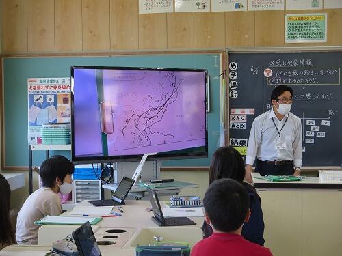研究授業の理科の様子です。「6月の台風の動きにきまりがあるのだろうか」という学習問題を調べるために、タブレットで過去の台風経路を調べて、そのデータをみんなで合わせました。どんなことが分かるのだろうとワクワクしながら、子ども達が調べる様子が印象的でした。