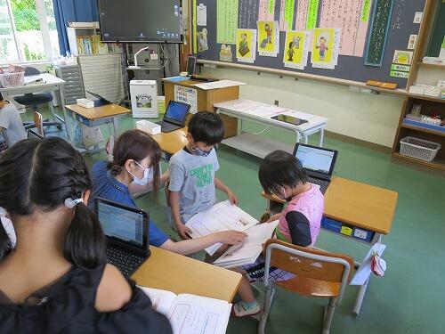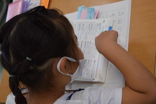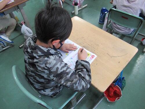 1年生は、国語の学習で国語辞典を使っていました。普通は、3年生から国語辞典の使い方を学習するので、とても驚きました。調べた言葉に付箋を貼っていました。言葉をどんどん覚えてほしいです。