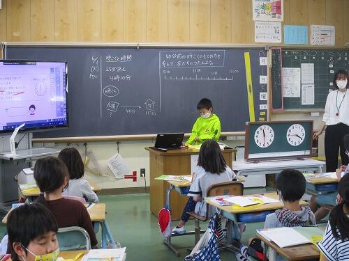 3年生は算数です。たずねている時刻を数直線を使って求めました。