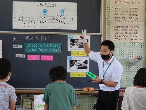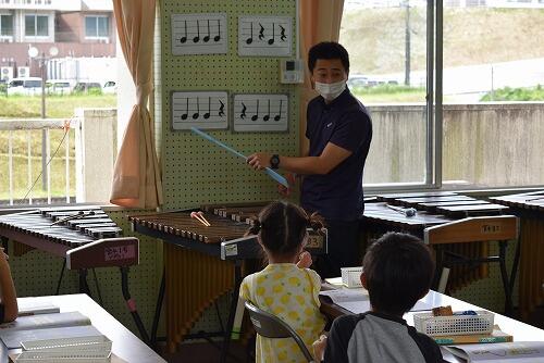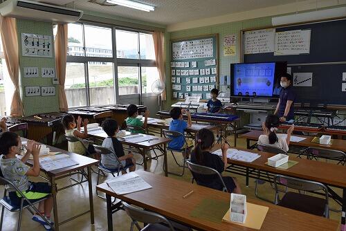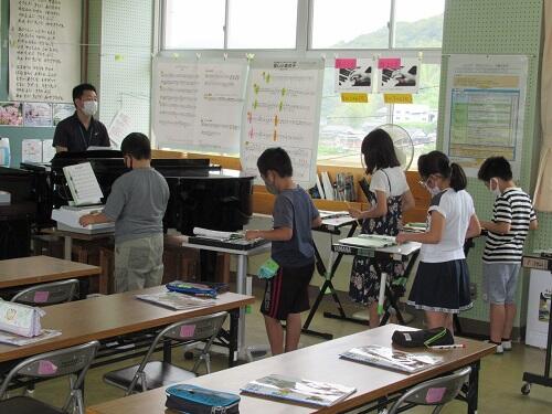 2年生は音楽の授業をしていました。新型コロナ対策でリコーダーや鍵盤ハーモニカの代わりに電子オルガンや鉄琴を使って演奏していました。みんなとてもリズム感がよくてとても上手です。阿野先生からたくさんほめられていました。