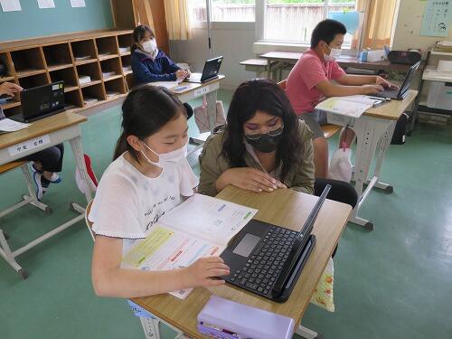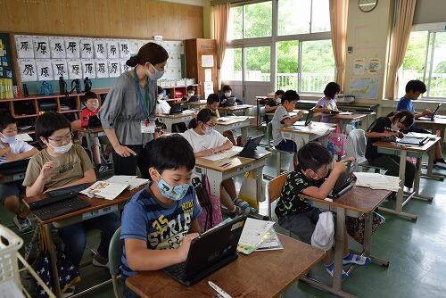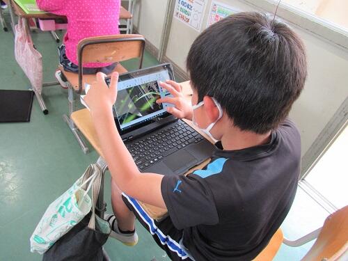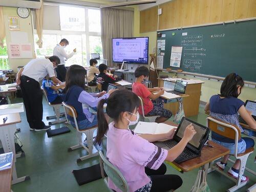 6年生は、算数の学習をしていました。自分の考えをタブレットを使って全体で説明をしていました。この前まで、考えを黒板に書いて指示棒などで指しながら説明していましたが、この時間では指示棒で指す代わりにタブレットに指で線を引きながら説明していました。授業スタイルもずいぶんと変化してきています。