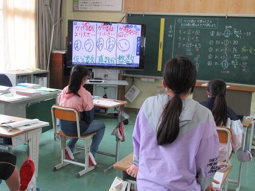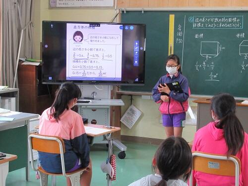 6年生は、算数の学習をしていました。かける数が分数の時のかける数と積の大きさについて考える学習でした。児童のタブレット画面を大型テレビに映し出して、発表していました。