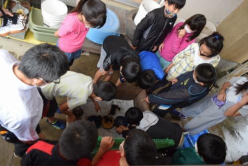 来週に生産活動(田植え、芋苗植え)を控えて、アイガモ農法に使うアイガモが学校に到着しました。とってもかわいいアイガモにお世話をする5年生は大喜び、抱いたり水を飲ませたりしました。