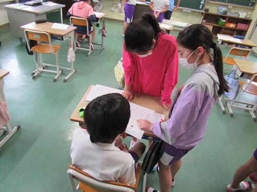 6年生は、全国学力テストのやり直しをしていました。本当に分かったか、最後に友達に解き方の説明をし合っていました。