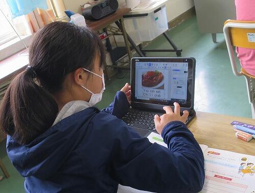 6年生が外国語の時間に「Where do you want to go?」(どこにいきたい?)の学習をしていました。自分が言ってみたい国を紹介するための画面を作成していました。とてもきれいな景色やおいしそうなものなど、様々な画像で楽しそうな紹介を作っていました。