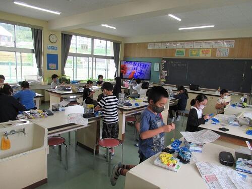 4年生は、「電気のはたらき」の学習をしていました。実験用のセットを使って、車を組み立てていましたが、説明書を見ながらつくるのに苦労しているようでした。昔の子どもはよくプラモデルをつくっていましたが、最近の子どもはゲームが主流なので少し慣れていないのかなと思いました。また、子どもの頃は意識することはありませんでしたが、知らず知らずのうちに説明書を読む力や思考力が培われていたんだなとも思いました。