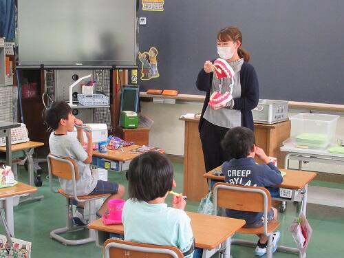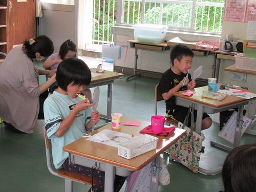 給食後の歯磨きの時間に、学習したことが生かせているか、もう一度ポイントを確認しながら歯を磨きました。「上手に磨けたかな?」