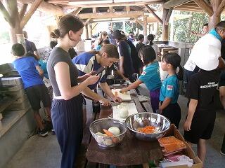 スポーツ少年団4年生以上の人がドイツの方々と交流活動を行いました。レクリエーションの後、日之影キャンプ村で「食文化体験」としてカレー作りを協力して行いました。企画、御指導いただいた町教育委員会、関係者の皆様、ありがとうございました。