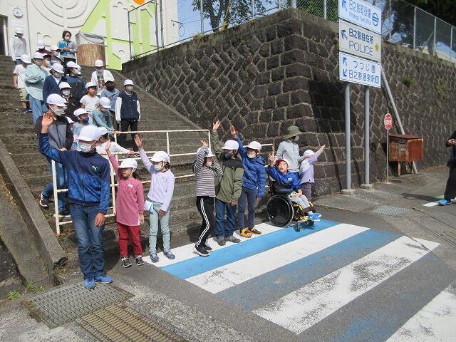 日之影駐在所、高千穂警察署、交通安全協会の方々に協力していただきながら、安全に道路を横断することができました。