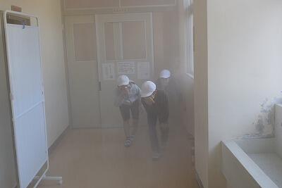 最後に煙のなかを避難する訓練を行いました。煙でまったく見えないなか、姿勢を低くして、かべを伝いながら避難することができました。