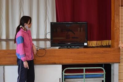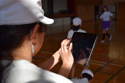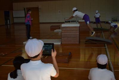 はじめに、模範となる映像を先生と見ながら、技のポイントを確かめました。そして、練習です。タブレットを使って、跳んでいる様子を友達にとってもらい自分で確かめました。自分のフォームを見て、何に気をつければよいか考えながら、練習することができていました。