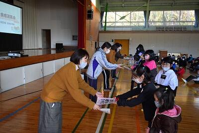 1月24日~30日は全国学校給食週間です。宮水小学校でも、給食感謝集会が行われました。はじめに保健・給食委員会の児童より、給食の歴史について説明がありました。そして、いつもおいしい給食を作ってくださっている給食センターの調理員さん達へ感謝の手紙を渡しました。