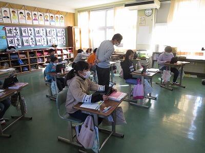 2年生は、作文の学習をしていました。お話に書くことのポイントを学習した後、実際に書いてみました。書くのは楽しいようで、鉛筆がスラスラと動いていました。書いた後に友達と読み合いをして、文章のよいところをたくさん見つけていました。
