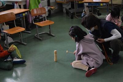 目をとじて挑戦していたのが福笑いです。自分が作った顔を見て、大笑いしていました。次に、だるまおとしです。はじめはなかなか難しかったのですが、コツをつかむと上手にできていました。