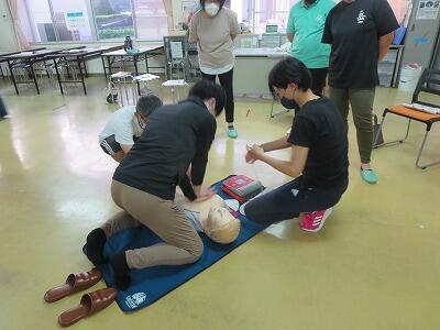 胸骨圧迫の角度やテンポ、手の当て方、AED使用の留意点などを丁寧に教えてくださいました。また、熱中症の症状についても具体的に説明していただきました。