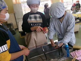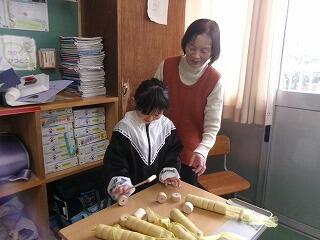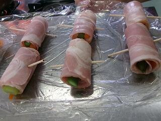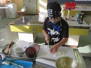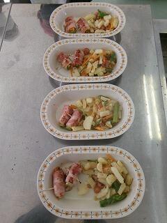6年生が調理実習で「野菜のベーコン巻、ジャーマンポテト」を作りました。