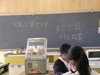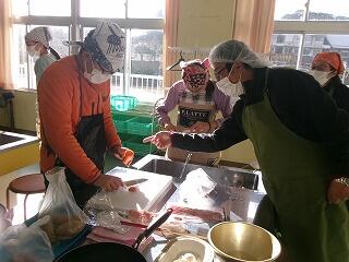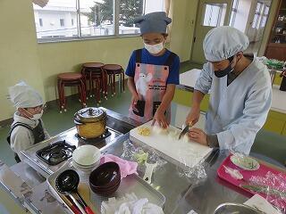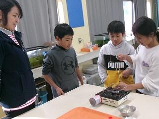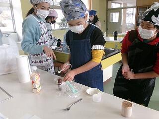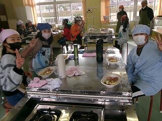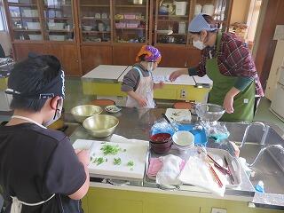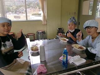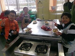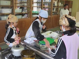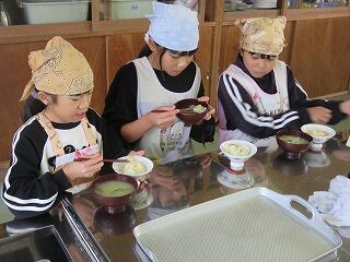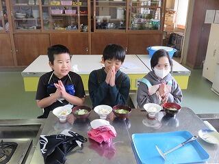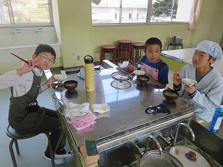 5年生が調理実習で「ご飯、みそ汁」を作りました。ご飯には育てた「もち米」で水を調整して使いました。