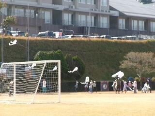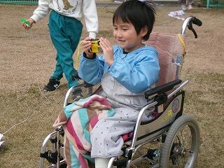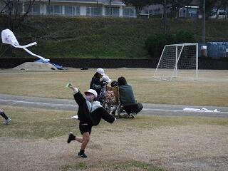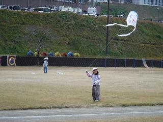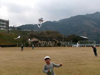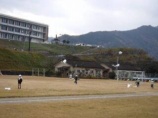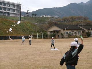 1年生がたこあげに挑戦しました。けがで歩けない人は活動の様子を撮影してくれました。