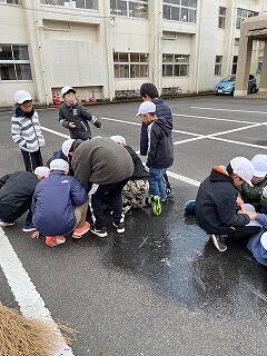寒い朝、水たまりが凍った場所にみんな集まっていました。
