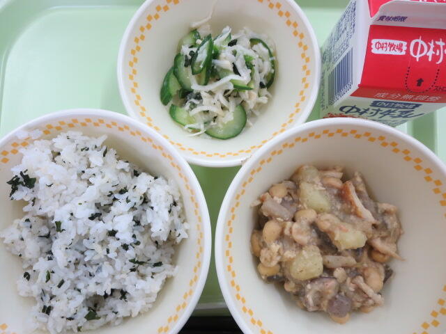 【わかめごはん 五目豆 切りぼし大根サラダ 牛乳】