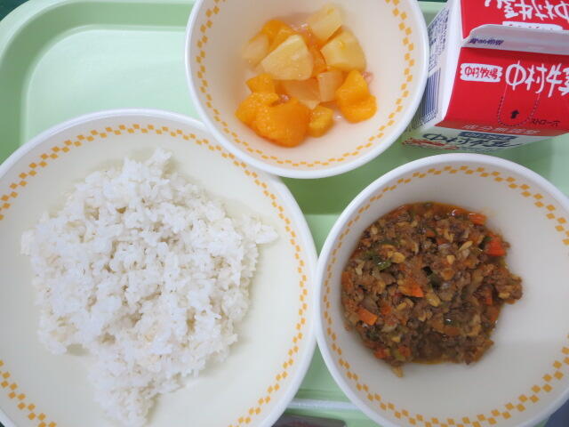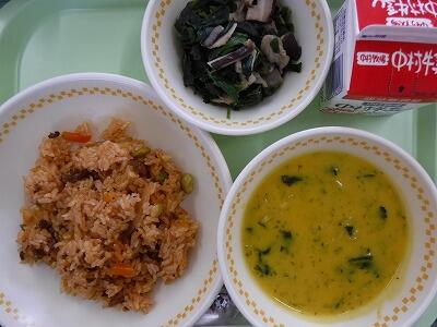 日本人は明治時代になるまで、ほとんど牛肉を食べていませんでしたが、江戸時代には、病気の人を元気にさせる薬として、牛肉が食べられていたそうです。牛肉には体を作ったり、元気のもとになってくれる「たんぱく質」が多くふくまれています。また、他の食べものからはとりにくい「鉄分」も多くふくんでいます。「鉄分」は血のもとになる成分です。今日は、地元の牛肉を使ったビーフライスです。味わって食べましょう。