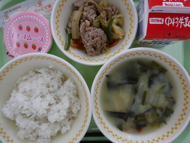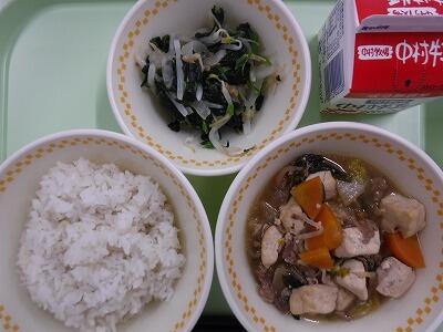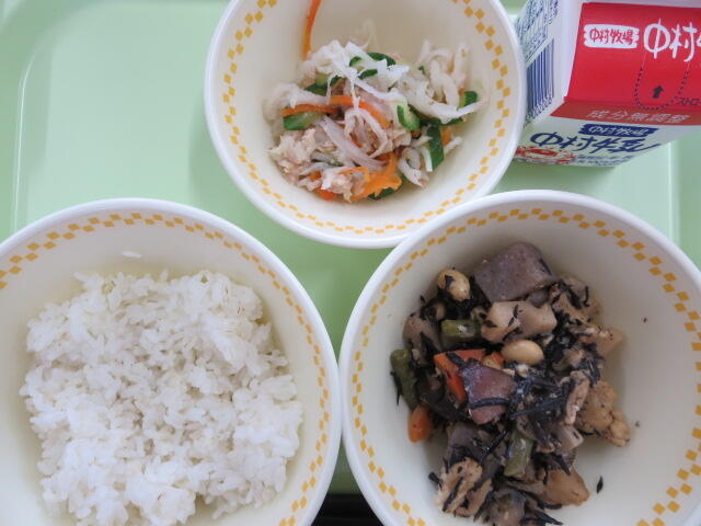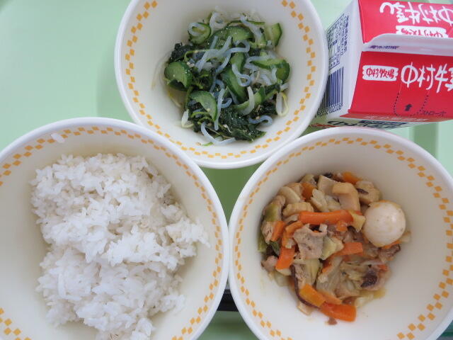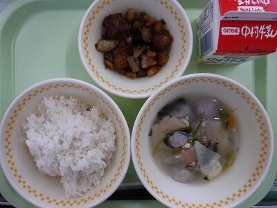 ごはんとおかずをいっしょに口の中で混ぜ合わせながら食べることを「口中調味」といいます。これは古くからの日本独特の食べ方です。しかし最近は、1つのおかずばっかりや、ごはんばっかり食べる「ばっかり食べ」をする人が増えています。「口中調味」という日本独特の食べ方をしていくと、ごはんの量を調節して濃い味に慣れないようにしたり、脳を活性化させる効果もあるそうです。今日の給食もごはんとおかずを交互に食べ、よくかんで体に優しい食べ方でいただきましょう。