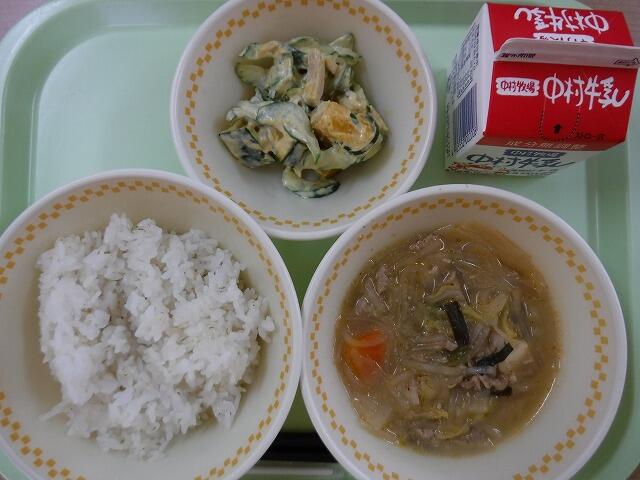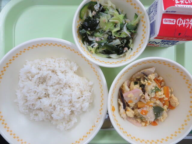 【しゃけチャーハン くらげの中華あえ ビーフンスープ 牛乳】