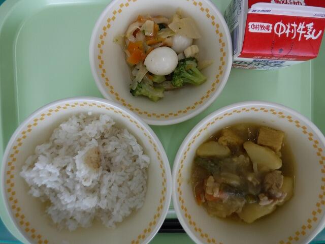 【麦ご飯 カレー肉じゃが ブロッコリーの海鮮炒め 牛乳】