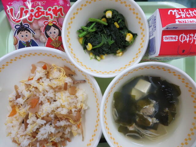 ゆず果汁を使ったちらしずしとあさりが入ったすまし汁、菜の花とほうれん草の和えもの、ひなあられなど、とても豪華な給食になりました。