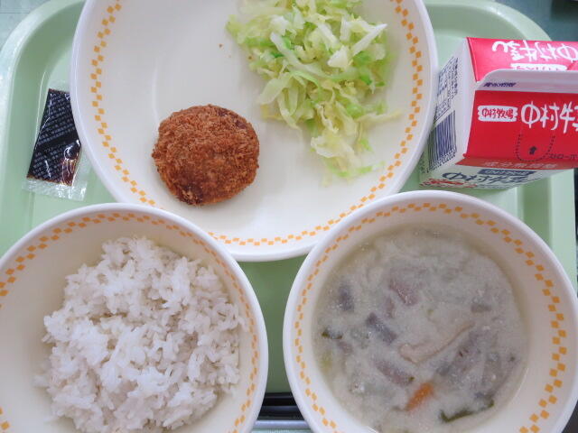 【麦ご飯 メンチカツ ゆできゃべつ 豆乳根菜汁 牛乳】