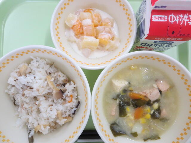 【山菜おこわ 石狩なべ フルーツヨーグルト和え 牛乳】