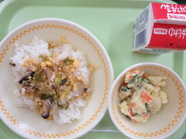 並べ、熱々のとりガラスープをかけて、お茶漬け風にいただく料理です。給食では、具をそれぞれ並べることができないので、混ぜ合わせています。ごはんの上に具をのせてその上からスープをかけて食べましょう。